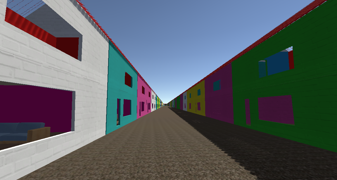Ähnlich wie beim NPC-Generator habe ich auch einen Stadt-Generator geschrieben, der anhand eines Straßenlayouts eine zufällige Stadt aus Reihenhäusern generieren konnte. Dieser funktionierte ebenfalls wunderbar, aber das Ergebnis sah wirklich dystopisch aus, da alle Häuser gleich aussahen und es keinerlei Abwechslung gab. Auch die Verwendung einer zufälligen Farbe für die Hauswand half dabei nicht wirklich.